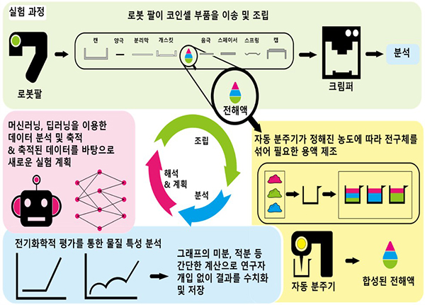 자율 실행 배터리 시스템은 배터리 연구에서 가장 널리 사용되는 코인 셀을 로봇이 직접 조립하고, 조립 직후 셀 성능을 자동으로 평가하는 시스템입니다. 사람이 일일이 조립하던 노동 집약적인 실험과정을 대신 수행하게 함으로써 실험 속도를 높이고, 휴먼 에러를 줄일 수 있습니다. 로봇팔이 셀 부품과 전극을 쌓고 전해액을 분주해 셀을 밀봉한 뒤 배터리 성능 평가가 이어집니다. 이렇게 수집된 데이터는 자동으로 분석되어 인공지능이 최적의 다음 실험 조건을 제안하기 때문에 연구가 효율적이며 빠르게 진행됩니다. 즉, 자동화와 인공지능을 결합해 실험의 설계부터 분석까지 스스로 수행하며 소재 개발을 가속화하는 “자율 주행형 실험 시스템”입니다.